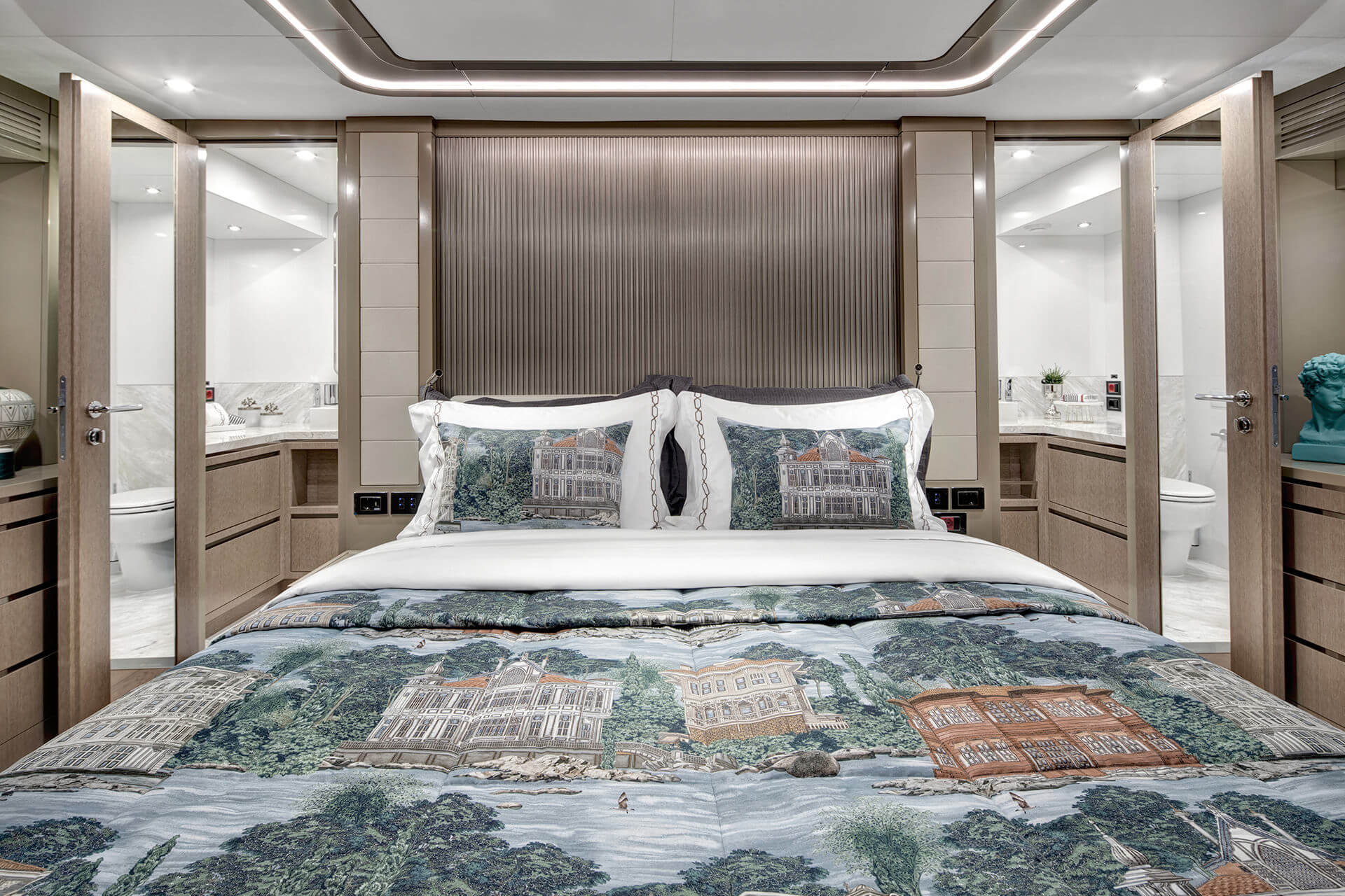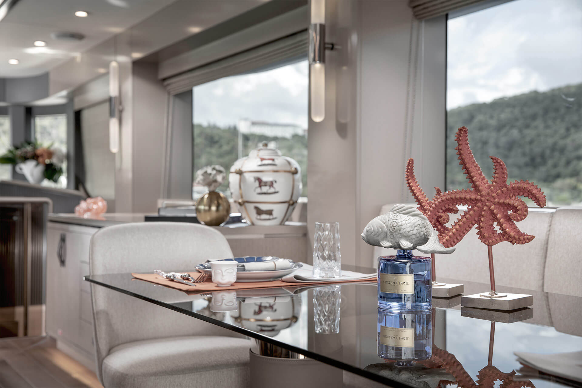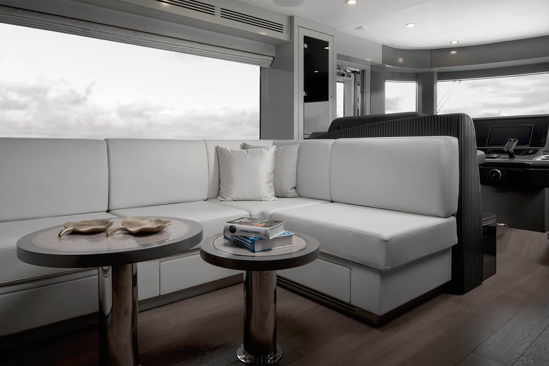 The shape of the hull also creates interior volume that changes the onboard experience for the owners and their guests. Anyone who sets foot on this yacht will find space to allow gatherings of large groups together, as on the flying bridge, the aft deck area, or the saloon, or even the foredeck, where the light and shadow, breezes and views combine to elevate the experience offer a real change of perspective.